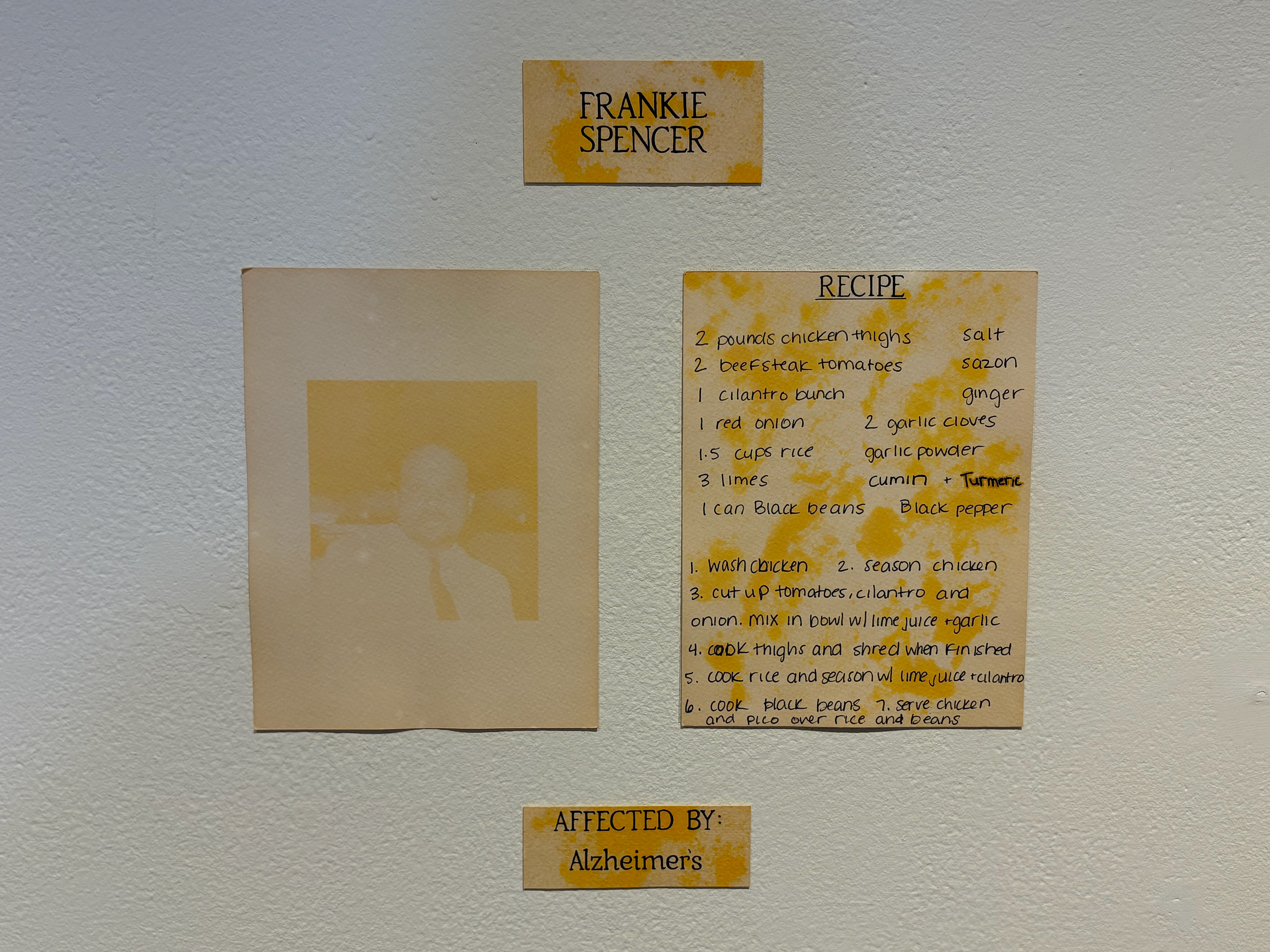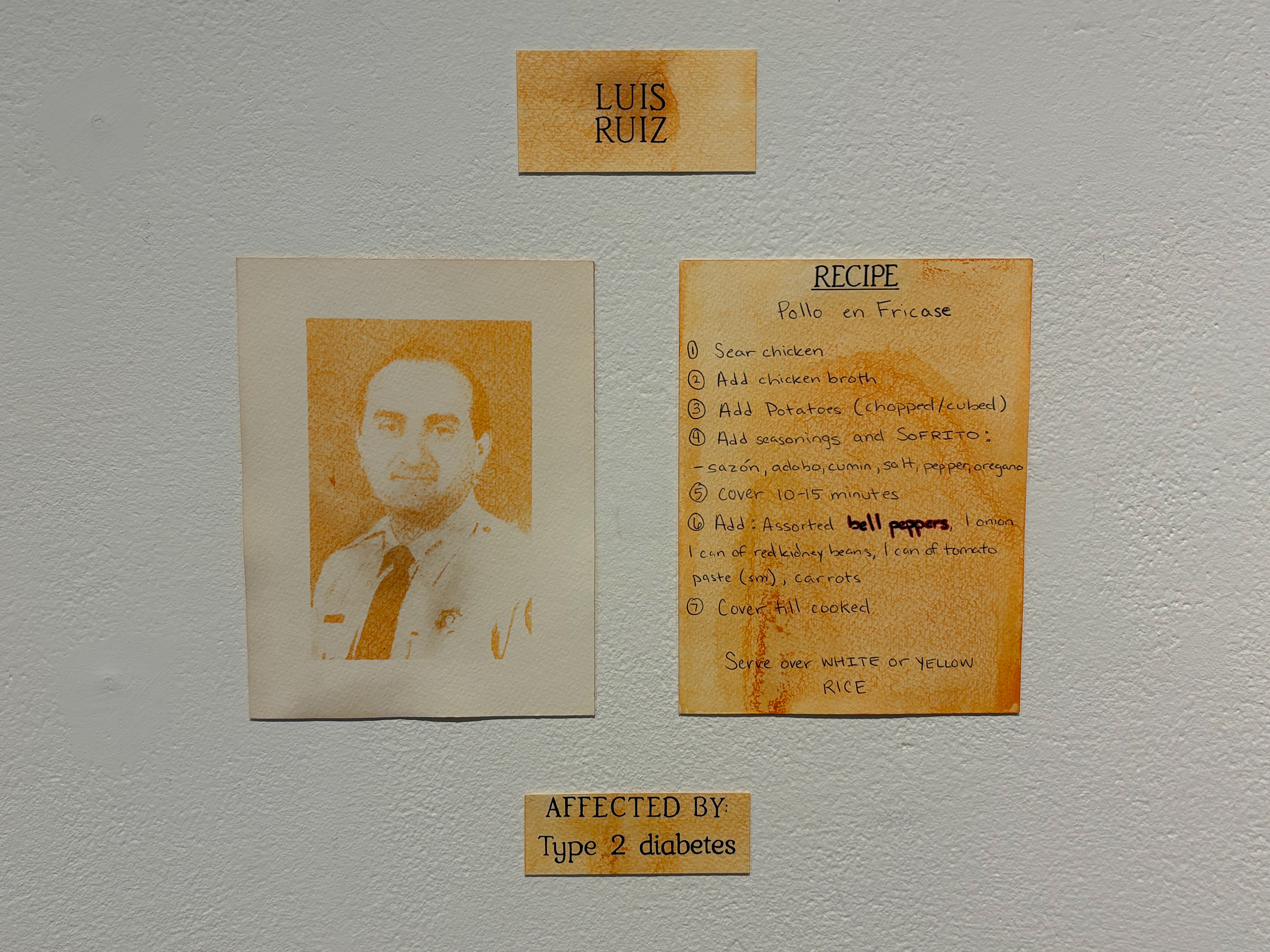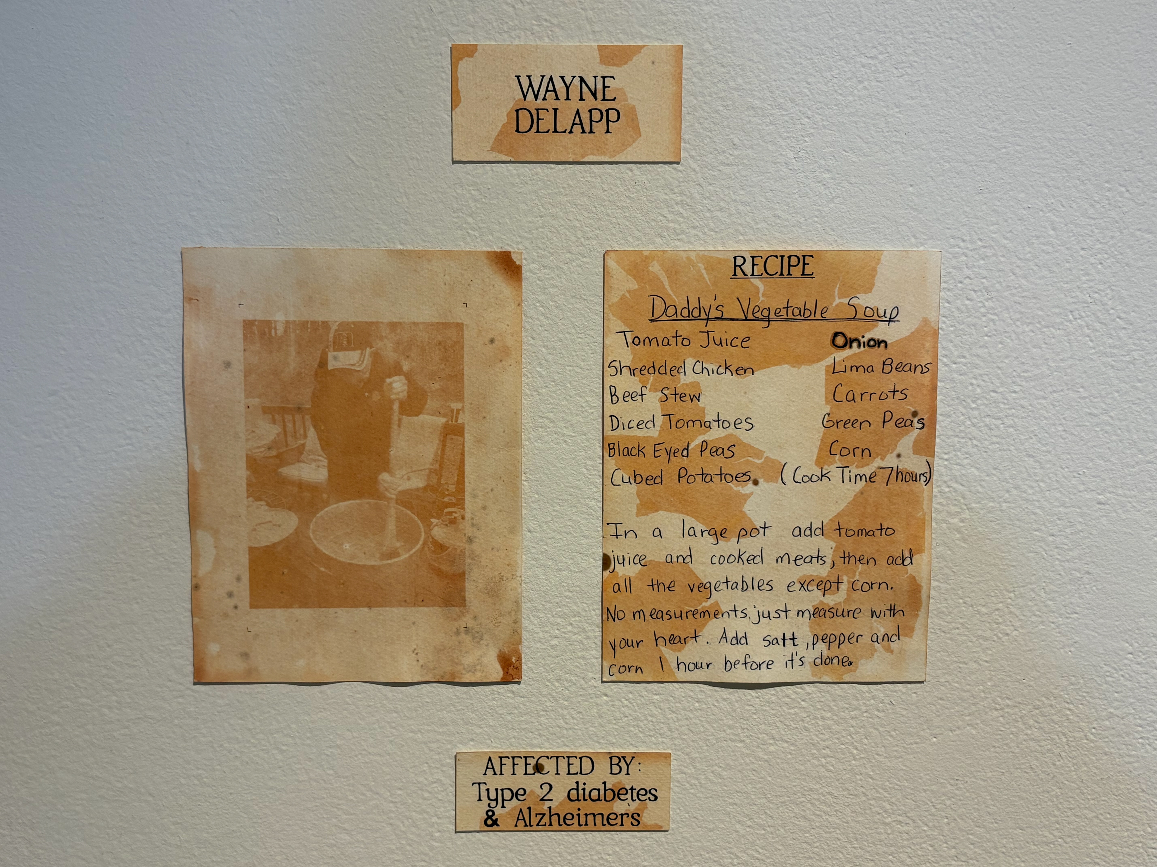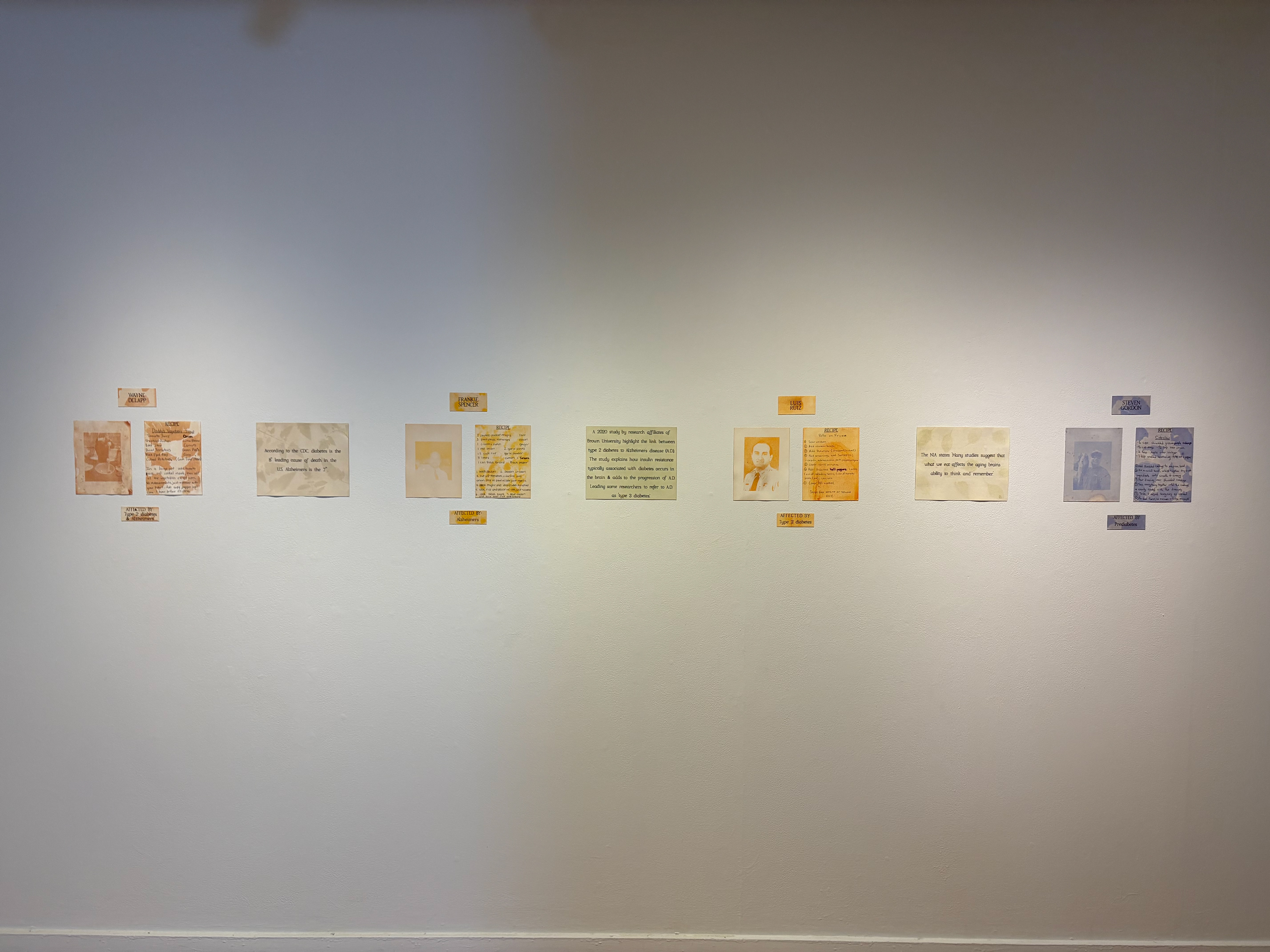 -2025- Portraits of Prevention is dedicated to my Papa, my mother’s father, Wayne Delapp, who had Type 2 diabetes and passed away from Alzheimer’s disease on February 14th, 2023. This community-based art project explores the connection between diabetes, Alzheimer’s, metabolic function, and food. The series features anthotype portraits and photograms created using diabetes-friendly foods, alongside anthotype recipes contributed by people affected by these conditions. Through this work, I aim to raise awareness, spark curiosity, and honor the experiences of those living with or impacted by diabetes and Alzheimer’s.